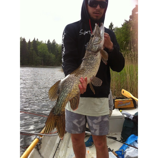 Nyinköpta SG Da Bush fick tid i vattnet nära vassen. Det visade sig att detta skulle löna sig för Jonathan. Brutalt hugg och perfekt mothugg drog de två enkelkrokarna långt igenom gäddans hårda mun. 5650 gram är Jonathans debutgädda på spinnerbait.