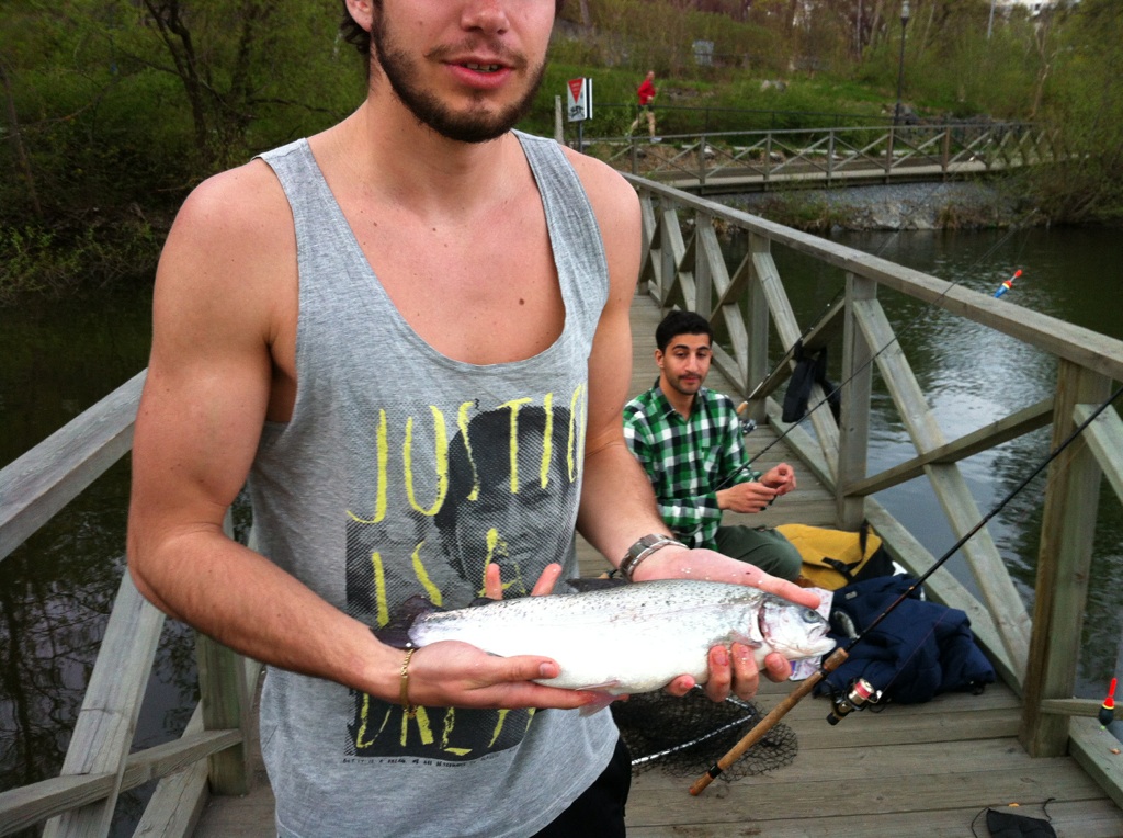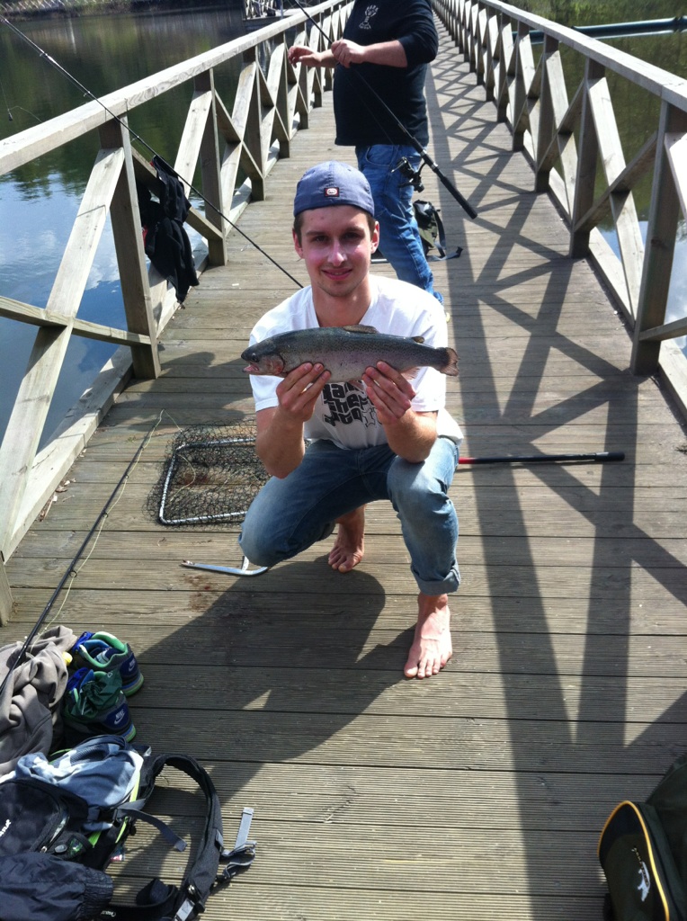 En något sen uppdatering. Den 9-10 maj begav sig Jonathan, Tjalle och Lukas till Trekanten i södra Stockholm för att försöka landa några av de nyinplanterade regnbågarna. Fisket var till en början trögt, beroende på val av tidpunkt och bete. Inte förrän framåt 20-tiden landades den första regnbågen av Jonathan, 940 gram och i fin kondition. Jonathan använde sig uteslutande av mete med räka.