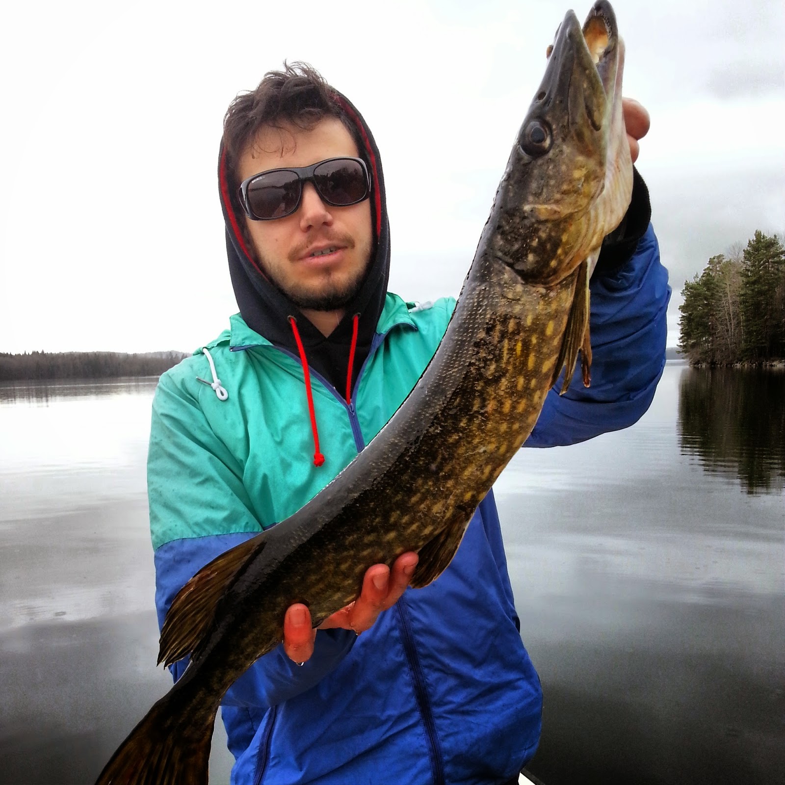 Tyvärr försämras vädret och de båda herrarna bestämde sig för att packa ihop prylarna. Då hugger en fin, tyvärr urlekt, gädda på runt 80 cm på Jonathans McMy. Fint hugg i ytan på grunt vatten.